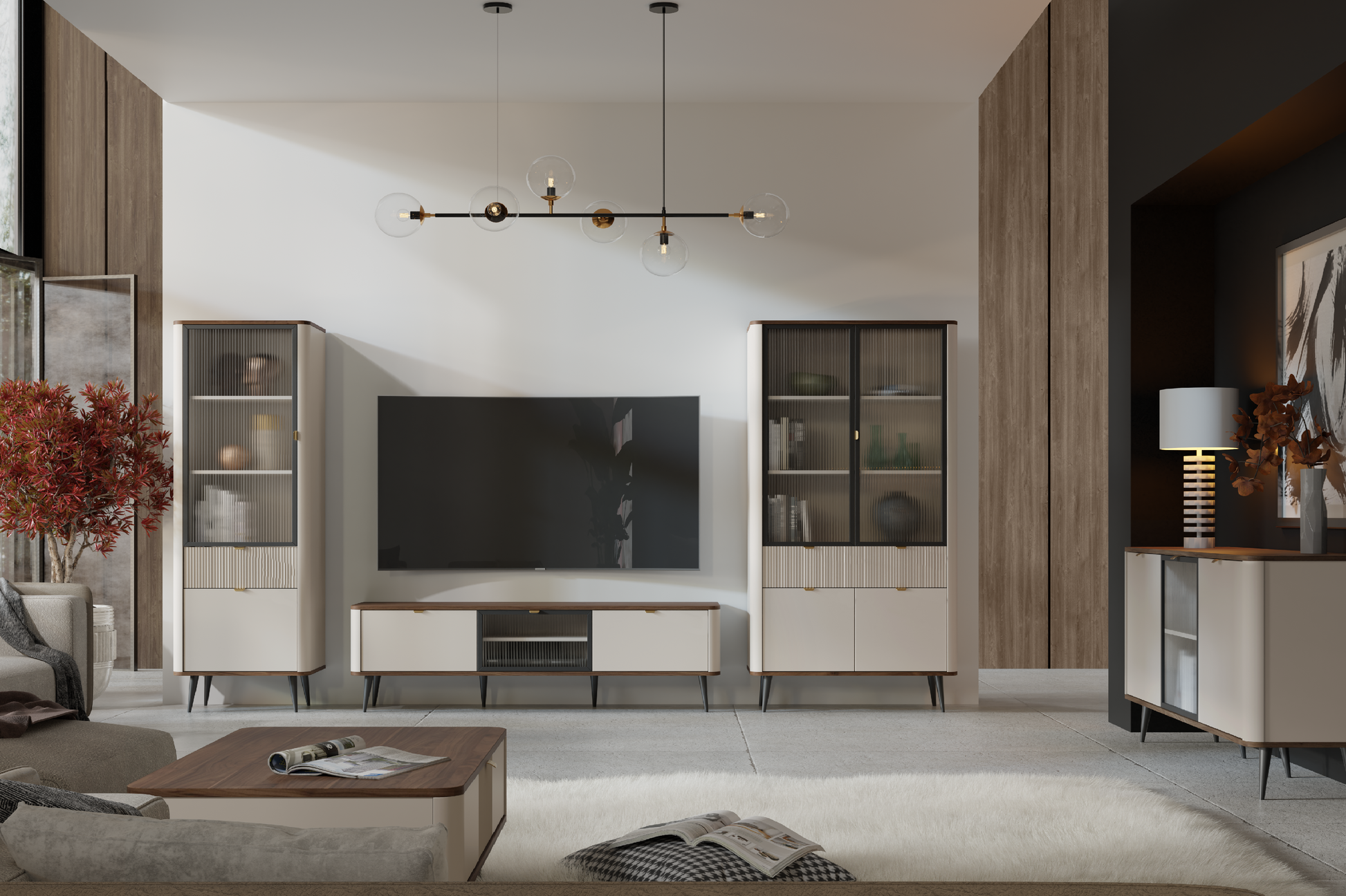 Komoda DOMANI to połączenie nowoczesnej elegancji i funkcjonalności. Jasny korpus uzupełniony blatem w naturalnym odcieniu drewna sprawia, że mebel wprowadza do wnętrza lekkość i ciepło. Smukłe, wysokie nóżki nadają mu subtelny, skandynawski charakter oraz ułatwiają utrzymanie porządku pod meblem. Dzięki przestronnym szafkom i praktycznym szufladom komoda zapewnia wygodne miejsce do przechowywania najważniejszych przedmiotów – od tekstyliów, przez dokumenty, aż po drobiazgi codziennego użytku.
